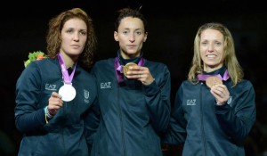 Individual Women’s Foil – London 2012 Olympics (l to r) Arianna Errigo – Silver, Elisa Di Francisca – Gold, Valentina Vezzali – Bronze. Photo courtesy of the FIS and Pegaso Newsport.
