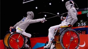 Chen Yijun (CHN) and Tian Jianquan (CHN) compete in the men’s Individual Sabre Wheelchair Fencing – Category A final on Day 8 of the London 2012 Paralympic Games at ExCeL.