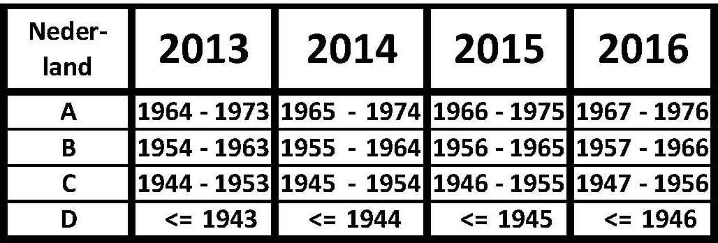 Per 1-1-2013 zijn de leeftijdscategorieën bij de Veteranen veranderd. De nieuwe categorie indeling zal aan de hand van het geboortejaar zijn en niet meer de leeftijd op de 1e dag van het toernooi.