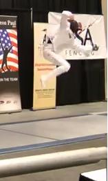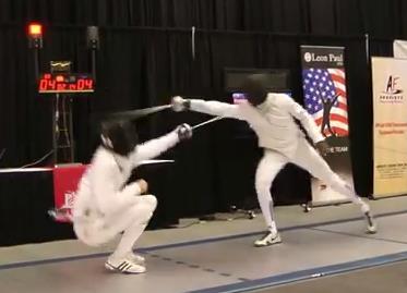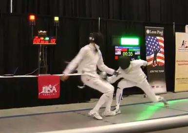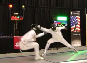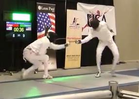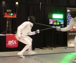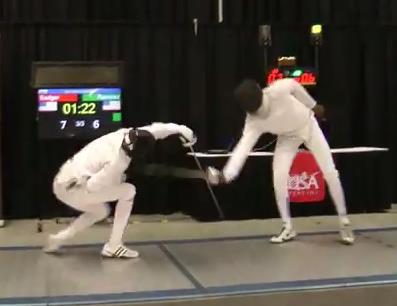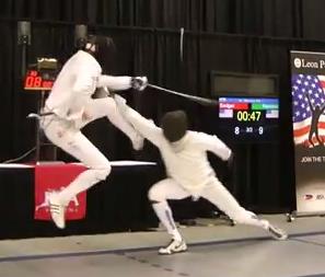 Hohensee says no, and Badger calls for a review. Call is upheld, and we’re still at 9-8 Ramirez. We’ve got just about forty seconds left, and Badger goes for a fleche way out of distance and is met with a simple 4 riposte. 10-8 Ramirez.