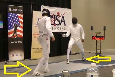 Badger comes out with another quick attack off the line and Ramirez backs off, hoping to clear the distance and close out Badger with his parry-ripostes that had been effective to this point. Badger does a HUGE feint to the outside of Ramirez’s guard…