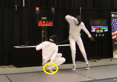 In changing angles, Badger is able to distort Ramirez’s perception of distance just a little more. Given the unpredictability of Badger’s fencing, this makes judgment of timing that much more difficult. Sure enough, it pays off, and Badger comes out with a beautiful feint to the toe with a remise under the wrist. Single light, 9-8.